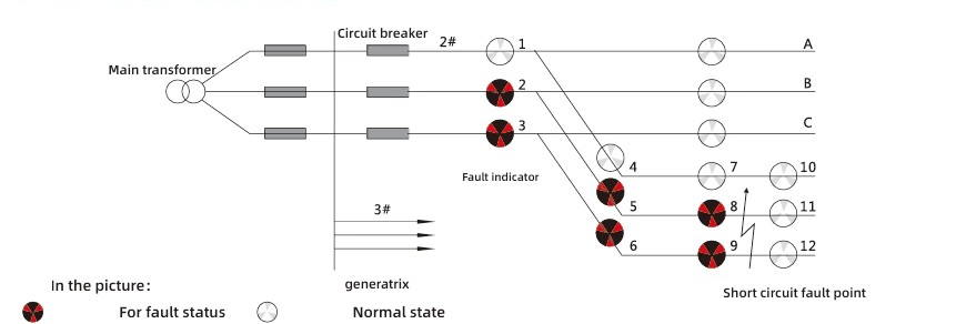 Baserat på egenskaperna hos kortslutningsfel är åtgärdskriteriet den plötsliga förändringen i ström som åtföljs av strömavbrott i skyddsanordningen. Tolkningslogiken för felindikeringsdiagrammet är som följer: om indikatorerna 2, 5 och 8 i fas A och indikatorerna 3, 6 och 9 i fas C på linje 2 alla blir röda, medan indikatorerna 11 och 12 förblir vita, kan det fastställas att ett kortslutningsfel har inträffat vid den utgående linjepunkten.